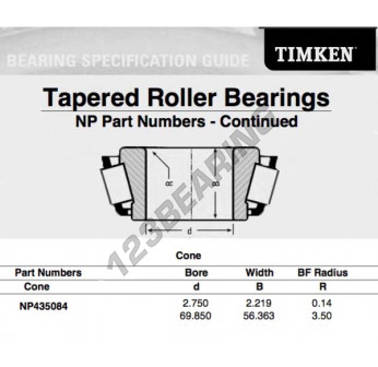 El Cono, conocido como NP435084-TIMKEN TIMKEN, tiene un diámetro interior de 69.85 mm.