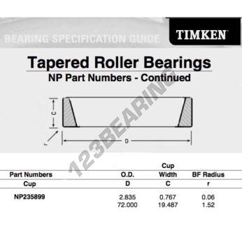 La Cubeta, conocida como NP235899-TIMKEN TIMKEN, tiene un diámetro interior de mm, un diámetro exterior de 72 mm y un espesor de 19.487 mm.