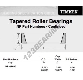 La Cubeta, conocida como NP259680-TIMKEN TIMKEN, tiene un diámetro interior de mm, un diámetro exterior de 65.088 mm y un espesor de 15.875 mm.