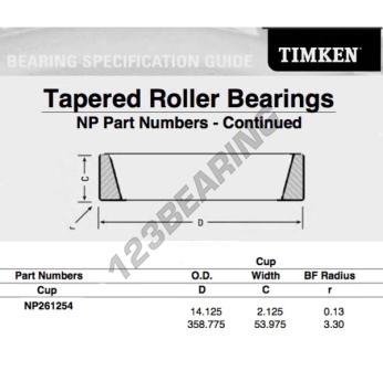 La Cubeta, conocida como NP261254-TIMKEN TIMKEN, tiene un diámetro interior de mm, un diámetro exterior de 358.775 mm y un espesor de 53.975 mm.