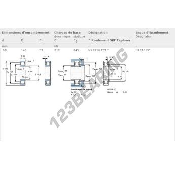 El Rodamiento Rodillos, conocido como NJ2216-ECJ-SKF SKF, tiene un diámetro interior de 80 mm, un diámetro exterior de 140 mm y un espesor de 33 mm.