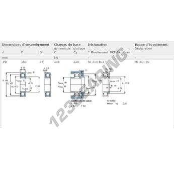 El Rodamiento Rodillos, conocido como NJ314-ECJ-SKF SKF, tiene un diámetro interior de 70 mm, un diámetro exterior de 150 mm y un espesor de 35 mm.