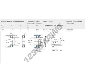 El Rodamiento Rodillos, conocido como NU216-ECP-SKF SKF, tiene un diámetro interior de 80 mm, un diámetro exterior de 140 mm y un espesor de 26 mm.