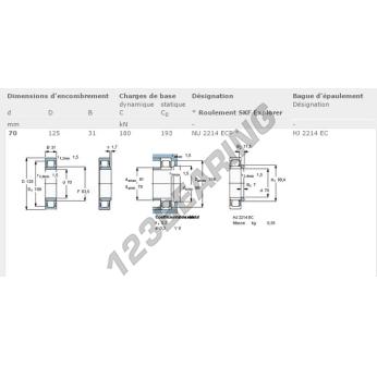 El Rodamiento Rodillos, conocido como NU2214-ECP-SKF SKF, tiene un diámetro interior de 70 mm, un diámetro exterior de 125 mm y un espesor de 31 mm.