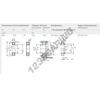 El Rodamiento Rodillos, conocido como NU2311-ECP-SKF SKF, tiene un diámetro interior de 55 mm, un diámetro exterior de 120 mm y un espesor de 43 mm.