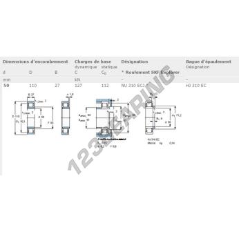El Rodamiento Rodillos, conocido como NU310-ECJ-SKF SKF, tiene un diámetro interior de 50 mm, un diámetro exterior de 110 mm y un espesor de 27 mm.