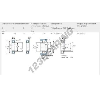 El Rodamiento Rodillos, conocido como NU312-ECP-SKF SKF, tiene un diámetro interior de 60 mm, un diámetro exterior de 130 mm y un espesor de 31 mm.