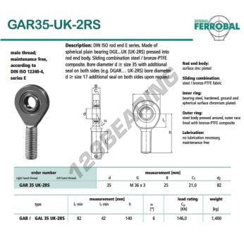 La Rótula Ge conocida como GAR35-UK-2RS-DURBAL DURBAL tiene un diámetro interior de 35 mm, un diámetro exterior de 82 mm y un espesor de 25 mm.