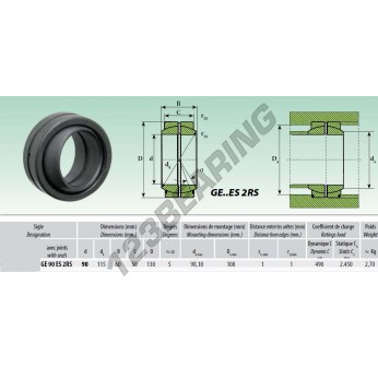 La Rótula Ge conocida como GE90-ES-2RS Genérico tiene un diámetro interior de 90 mm, un diámetro exterior de 130 mm y un espesor de 60 mm.
