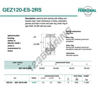 La Rótula Geew conocida como DGEZ120-ES-2RS-DURBAL DURBAL tiene un diámetro interior de 120.65 mm, un diámetro exterior de 187.325 mm y un espesor de 90.475 mm.