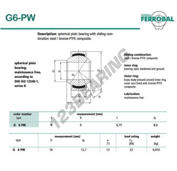 La Rótula Geew conocida como G6-PW-DURBAL DURBAL tiene un diámetro interior de 6 mm, un diámetro exterior de 16 mm y un espesor de 6.75 mm.