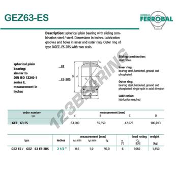 La Rótula Geew conocida como GEZ63-ES-DURBAL DURBAL tiene un diámetro interior de 63.5 mm, un diámetro exterior de 100.013 mm y un espesor de 47.625 mm.