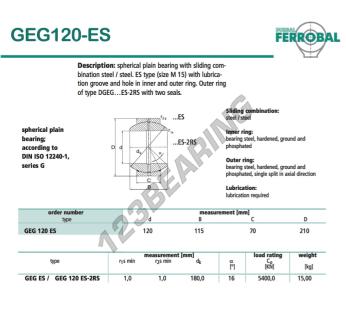 La Rótula Geg conocida como GEG120-ES-DURBAL DURBAL tiene un diámetro interior de 120 mm, un diámetro exterior de 210 mm y un espesor de 70 mm.