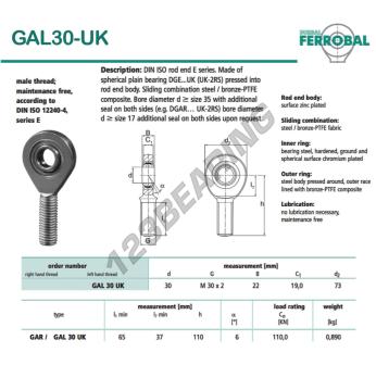 La Rótula Sa conocida como GAL30-UK-DURBAL DURBAL tiene un paso de rosca de , un diámetro interior de 30 mm, un diámetro exterior de 73 mm y un espesor de 22 mm.