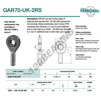 La Rótula Sa conocida como GAR70-UK-2RS-DURBAL DURBAL tiene un paso de rosca de , un diámetro interior de 70 mm, un diámetro exterior de 160 mm y un espesor de 49 mm.