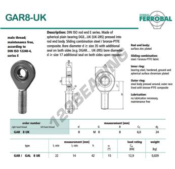 La Rótula Sa conocida como GAR8-UK-DURBAL DURBAL tiene un paso de rosca de , un diámetro interior de 8 mm, un diámetro exterior de 24 mm y un espesor de 8 mm.