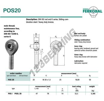 La Rótula Sa conocida como POS20-DURBAL DURBAL tiene un paso de rosca de , un diámetro interior de 20 mm, un diámetro exterior de 50 mm y un espesor de 25 mm.