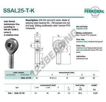 La Rótula Sa conocida como SSAL25-T-K-DURBAL DURBAL tiene un paso de rosca de , un diámetro interior de 25 mm, un diámetro exterior de 60 mm y un espesor de 31 mm.