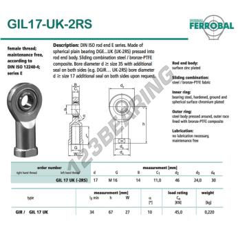 La Rótula Si conocida como GIL17-UK-2RS-DURBAL DURBAL tiene un diámetro interior de 17 mm, un diámetro exterior de 46 mm y un espesor de 14 mm.
