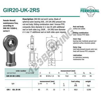 La Rótula Si conocida como GIR20-UK-2RS-DURBAL DURBAL tiene un diámetro interior de 20 mm, un diámetro exterior de 53 mm y un espesor de 16 mm.
