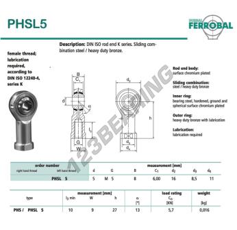 La Rótula Si conocida como PHSL5-DURBAL DURBAL tiene un diámetro interior de 5 mm, un diámetro exterior de 16 mm y un espesor de 8 mm.