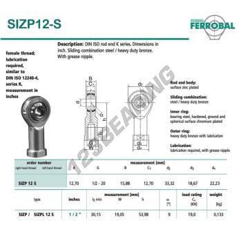 La Rótula Si conocida como SIZP12-S-DURBAL DURBAL tiene un diámetro interior de 12.7 mm, un diámetro exterior de 33.32 mm y un espesor de 15.88 mm.